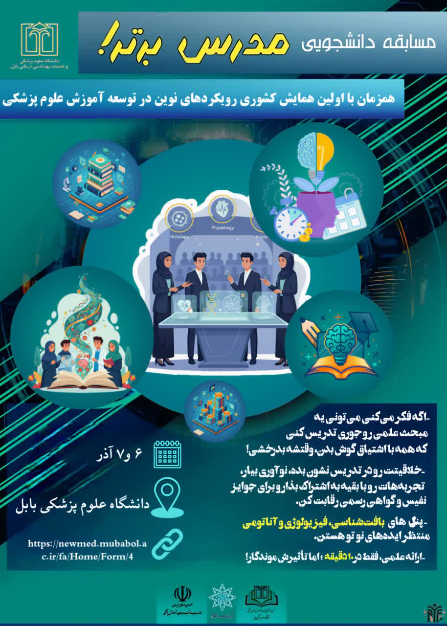 اولین همایش کشوری رویکردهای نوین در توسعه آموزش پزشکی و اولین رویداد دانشجویی مسابقه مدرس برتر به میزبانی دانشگاه علوم پزشکی بابل در تاریخ های 6 و7 آذرماه 1404، مهلت ارسال چکیده مقالات و ثبت تجربه های آموزشی تا تاریخ 15 آبانماه 1404 می باشد.