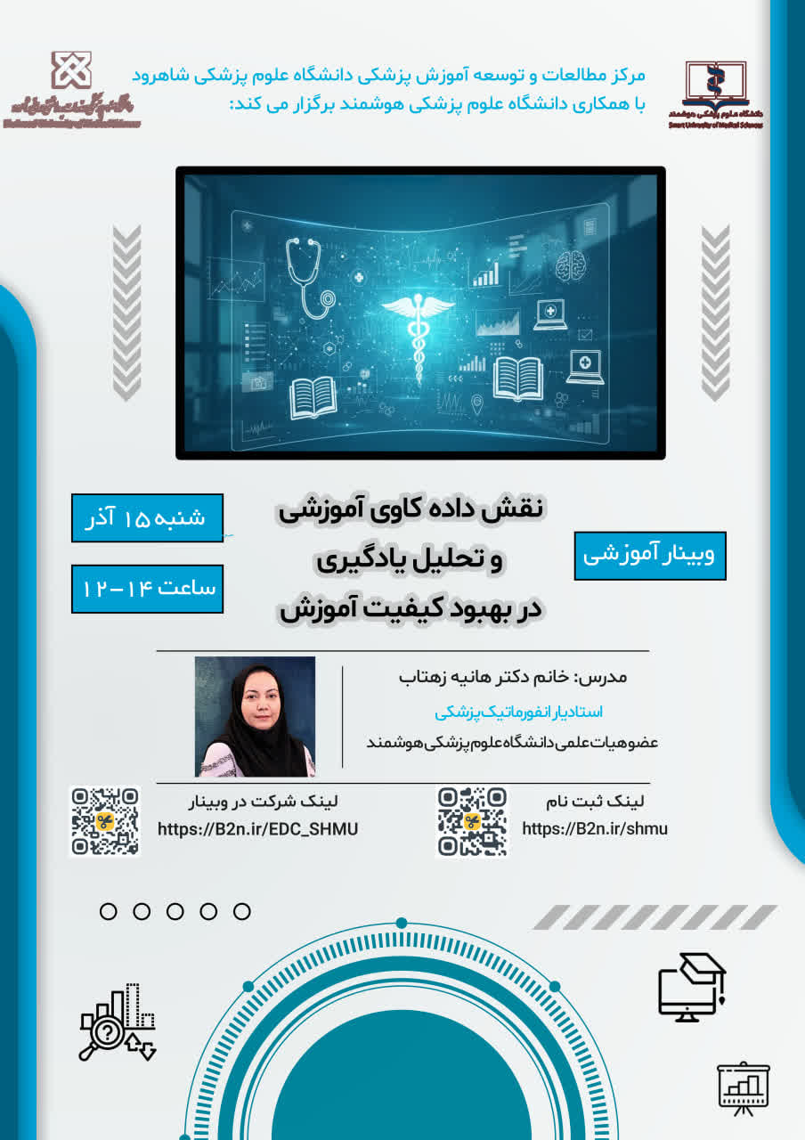 وبینار آموزشی با عنوان"نقش داده کاوی آموزشی و تحلیل یادگیری در بهبودکیفیت آموزش" با سخنرانی سرکارخانم دکتر هانیه زهتاب عضو هیات علمی دانشگاه علوم پزشکی شاهرود ، در تاریخ 15 آذر ماه۱۴۰۴ از ساعت 12 الی ۱4 به صورت مجازی برگزار خواهد شد.